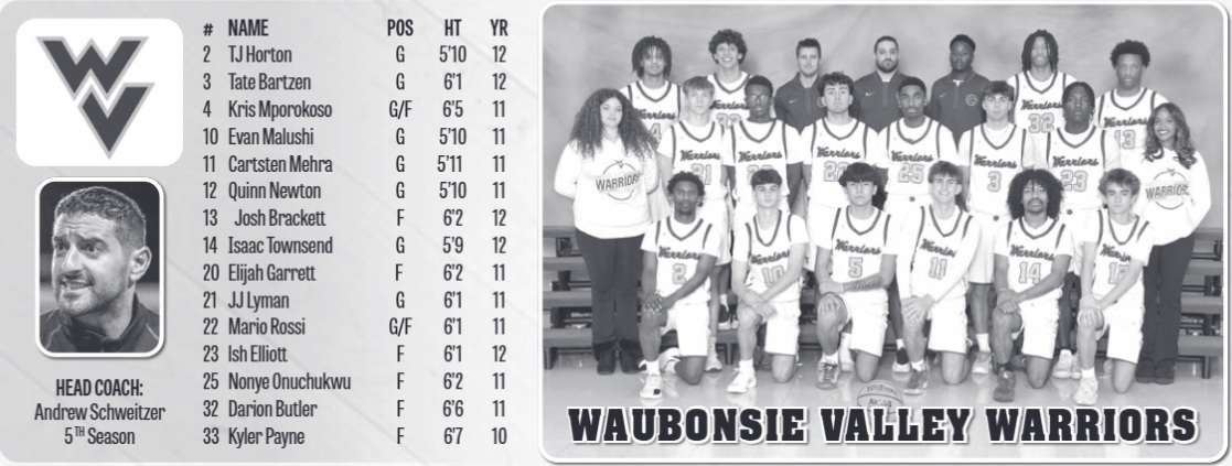 SCOUTING THE WARRIORS: Waubonsie Valley is one of three schools that are making their debut on the Hinsdale hardwood this season. The Warriors have a 58-6 record the past two seasons. Coach Andrew Schweitzer is in his fifth year with the Warriors. 6'5" Kris Mporokoso returns from last year's 31-win varsity club, averaging 8.5 points per game and was an honorable mention All-DVC selection as a sophomore. Also look for 6'6" sophomore Kyler Payne to make a contribution. |